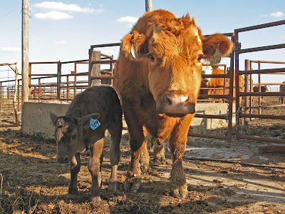 The calf walked closer and the mother was right beside it and soon after I took this photo she turned in front of the calf to put her body between me and the calf. Notice the matching ear tag numbers - 309. We tag the calf with the mother's number so we know which calf belongs to which mother. John always likes to tease that the number in the calf's ear is so the mother can run around looking for her "kid" by the number. The cow knows which baby is hers but we can't tell the difference, especially when all 100+ cows have had their calves so the ear tag number system is for us not her.